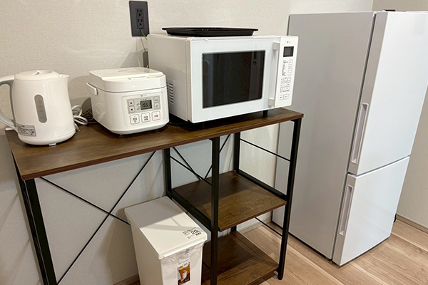 Wi-Fi完備、浴室(浴室乾燥機付き)とトイレはセパレートしており、電気コンロ・冷蔵庫・洗濯機・電子レンジの定番電化製品に加えて、炊飯器・調理器具に食器類を揃えてあります。食材や調味料は各自ご用意ください。